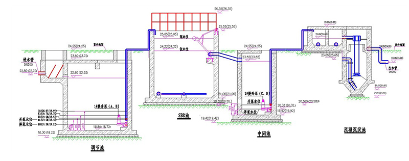 其中,SBR池和混凝池、沉淀池,均設排泥管,并各設一電動排泥閥,由污泥泵進行定期排泥,排泥進入污泥池,人工對污泥池進行定期外排。